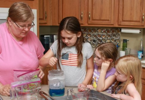 Grandma Lisa taught the girls about rocks & minerals.  First, they set up a rock tumbler (which took several days to complete) to polish rough rocks into smooth & pretty treasures.  Second, they started a crystal experiment where each girl grew colorful crystals.  Third, they sorted and broke geodes with a hammer.   For snack, they made “No-Bake chocolate cookies” which were supposed to look like a rocks and turned out to be a favorite snack of the week.