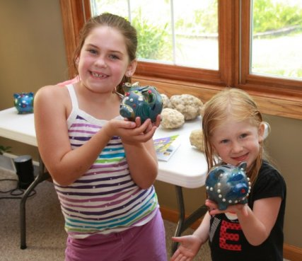 To start the morning off the girls got to play with lots of fun craft supplies:  ribbons and trims, paint markers, faux jewels and pearls, brads, and glue dots. They each decorated a piggy banks, jeweled flower clips, and headbands.
